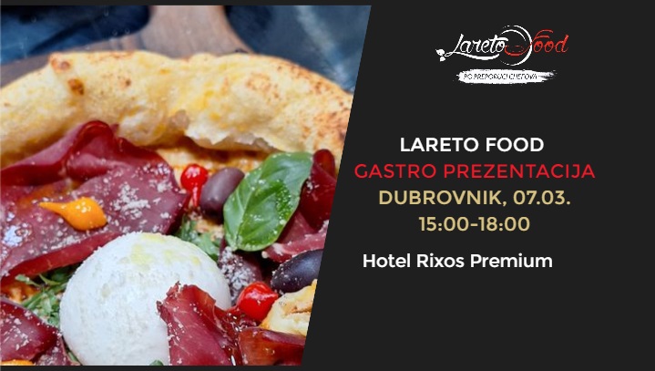 Pozivamo Vas na LARETO food gastro prezentaciju i druženje koje će se održati u Dubrovniku u četvrtak 07.03.2024. od 15:00 do 18:00 u hotelu RIXOS PREMIUM (Liechtensteinov put 3, 20000, Dubrovnik).