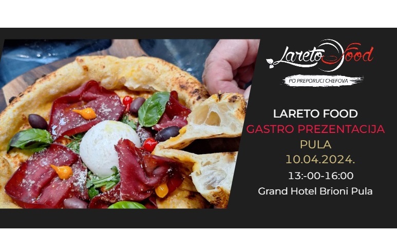 Pozivamo Vas na LARETO Food gastro prezentaciju i druženje koje će se održati u Puli u srijedu 10.04. od 13:00 do 16:00 u Grand Hotel BRIONI Pula (Verudela 16, 52100, Pula).